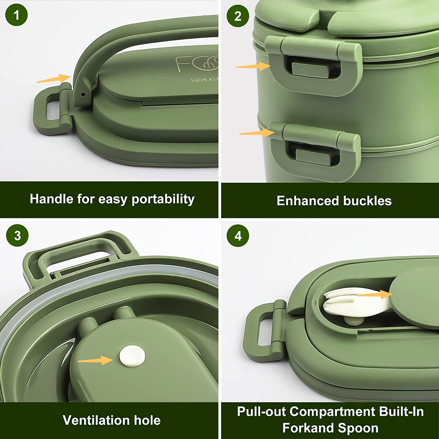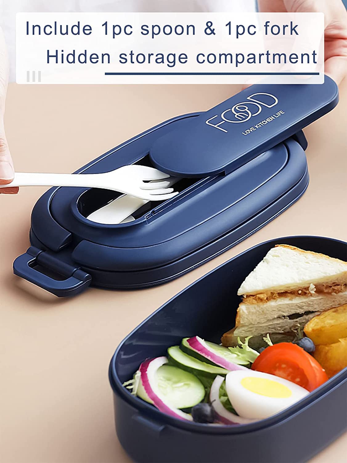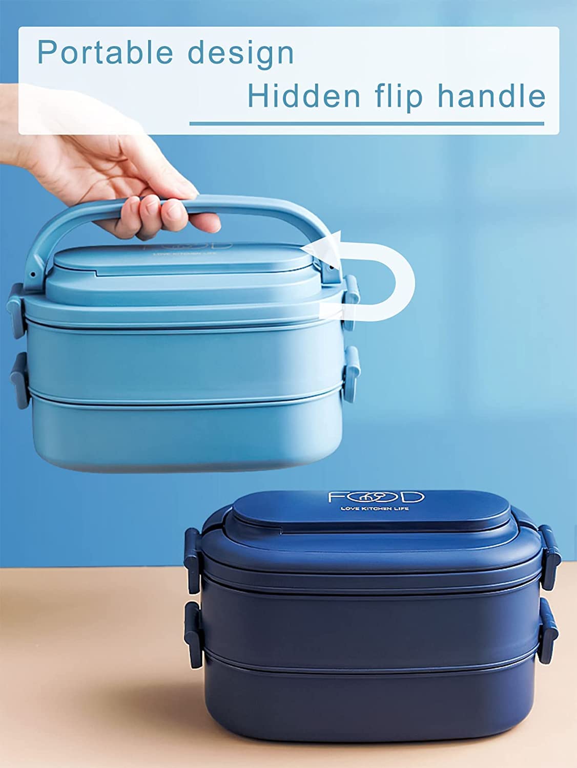 - Large Capacity Stackable Bento Box - The excellent design of this lunch box comes from our consideration of customer first experience -- hidden folding handle and storage compartment on the lid. The total capacity of this lunch box is 1550ml in 2 layers for packing enough healthy food for adults or child. Package includes 1 x spoon & 1 x fork.